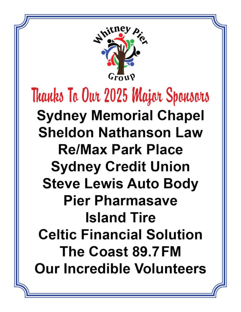 Your business or organization has the opportunity to support the efforts of the Whitney Pier Group Society. Our attendees come from all parts of the CBRM. They know our sponsors. We believe in giving value to a sponsor's investment. In addition to being affiliated with a successful festival, see the attached list of benefits to your business or organisation. We thank you for your time and consideration in making our events successful.